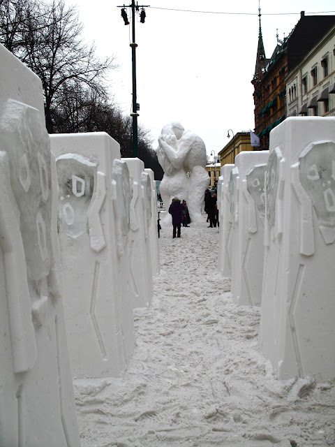 Frode Holgersen from Kristiansand is presenting the sculpture "Kyss" (Kiss) in snow. This sculpture is centrally located on Karl Johan Street. "Kyss" is six metres tall and has a diameter of about three metres. "Kyss" is sponsored by DnB Nor.